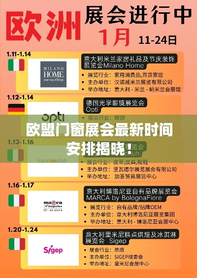 随着全球经济的不断发展和深化,门窗行业作为建筑业的重要组成部分,日益受到关注,欧盟门窗展会作为行业内最具影响力的盛会之一,汇集了全球最新的门窗产品、技术、设计及趋势,本文将详细介绍欧盟门窗展会的最新时间安排及相关动态。