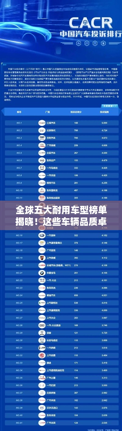 就是世界五大耐用车排名榜的部分内容,这些车型在品质、性能、可靠性等方面均表现出色,是消费者值得信赖的选择,每个消费者的需求和喜好不同,购车时还需根据自身实际情况进行选择,随着科技的发展,新能源汽车的兴起也为消费者提供了更多选择,在未来,我们期待更多的汽车制造商推出更多高品质、耐用的车型,满足消费者的需求。