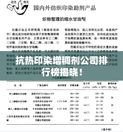 随着全球经济的不断发展和科技的持续进步,印染行业也日新月异,特别是在高温环境下,抗热印染增稠剂的需求日益增加,本文将对抗热印染增稠剂领域的公司进行排名,以便为大家提供参考。