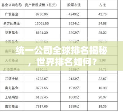 统一公司在世界范围内的排名受到多种因素的影响,包括公司的营业收入、市场份额、品牌影响力等,根据最新的数据,统一公司在国际上的排名有所上升,表现出良好的发展势头,要准确了解统一公司的世界排名,还需要关注各种权威机构发布的全球企业排名榜单,如《财富》杂志、《福布斯》等。
