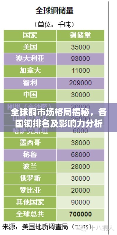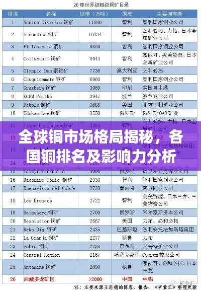 随着全球经济一体化的深入发展,铜作为一种重要的金属资源,其战略地位日益凸显,各国铜资源的丰富程度、开采技术、消费能力等因素,直接影响着全球铜市场的格局,本文将围绕“世界各国铜排名”这一主题,探讨各国在全球铜市场中的地位及未来发展趋势。