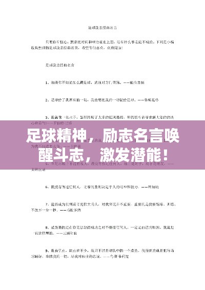 足球不仅仅是一项运动,更是一种精神,一种挑战自我的精神,一种团结协作的精神,在足球场上,每一个球员都在用自己的汗水和努力诠释着足球精神,这种精神也激励着我们面对生活的各种挑战,以下是一些足球精神的励志语录,希望能够激励我们不断前行。