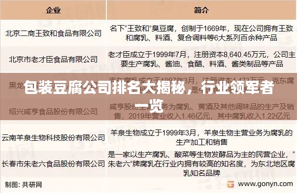 在食品行业中,包装豆腐作为重要的细分领域,近年来逐渐受到广泛关注,随着消费者对健康食品需求的增加,包装豆腐市场呈现出蓬勃的发展态势,本文将为您揭示包装豆腐公司的排名,带您了解行业内的领军者。