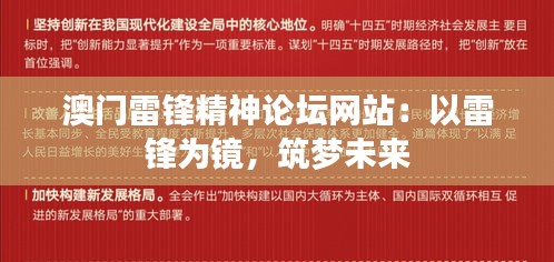澳门雷锋精神论坛网站是一个专注于传承和宣传雷锋精神的网络平台,致力于以雷锋为镜,引导人们筑梦未来。在这个平台上,可以找到大量有关雷锋生平和精神的文献资料,作为研究雷锋精神的重要参考。