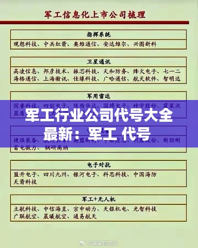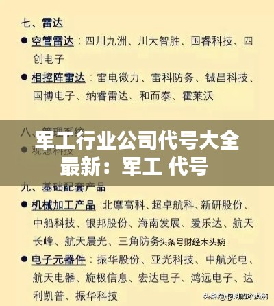 军工行业作为国家安全和军事力量的重要组成部分,其公司代号往往具有特殊的意义。这些代号不仅代表了企业的身份,还承载着行业特点和历史传承。以下是对军工行业公司代号大全的最新概述。